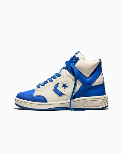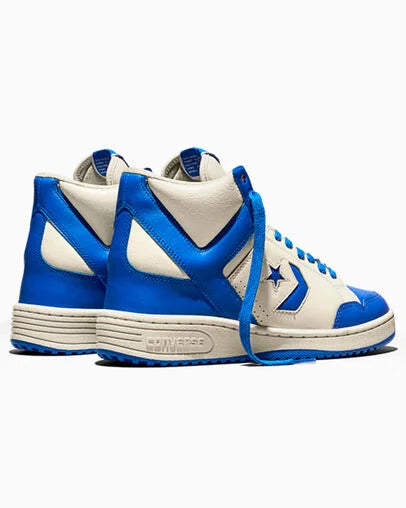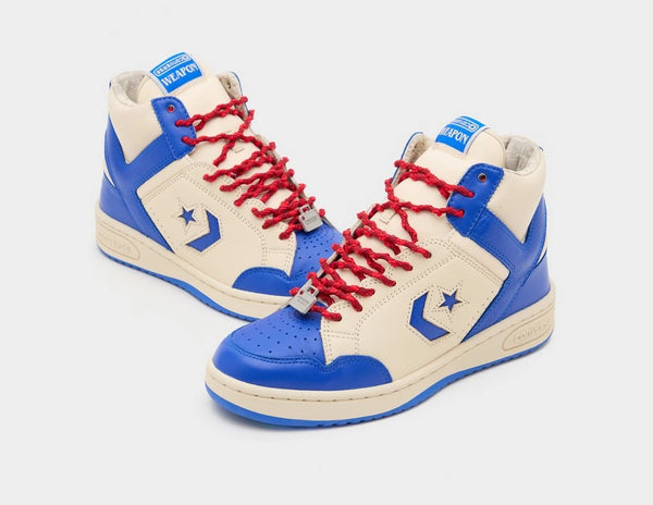 "CONVERSE(コンバース)"の名作バスケットシューズ"WEAPON(ウェポン)"が、"NETFLIX(ネットフリックス)"の人気シリーズ"STRANGER THINGS(ストレンジャー・シングス)"の最終章を記念し、ホーキンス仕様になって登場する。オフホワイトとブルー、ホワイトのカラーブロッキングは、1984年当時のオリジナルカラーやクラシックなNBAチームを彷彿とさせる80年代ノスタルジーの象徴である。アッパーの上質なレザーにはクラックや色褪せたディストレスト加工が施され、、「ホーキンスの高校生が履いてバスケットボールをしていそう」なリアリティを演出。1980年代の劇中の設定にマッチするヴィンテージ感を醸し出している。